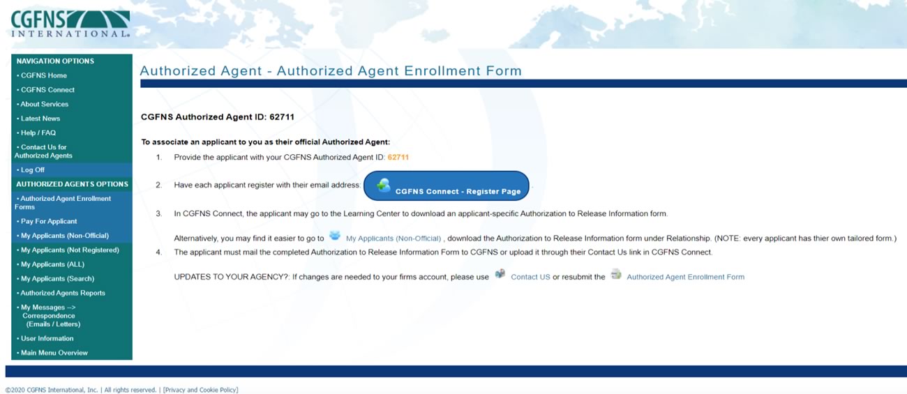 The Authorized Agent Portal is your dedicated site to manage your relationships with Applicants who have acknowledged that you are their Authorized Agent. Use the portal to log in and act on their behalf to place orders, update their account information, and manage communications. The portal also provides multiple employees in your organization with the ability to help applicants manage their new profiles, as CGFNS now requires all applicants to have unique email addresses as their usernames. Here’s how to get started: